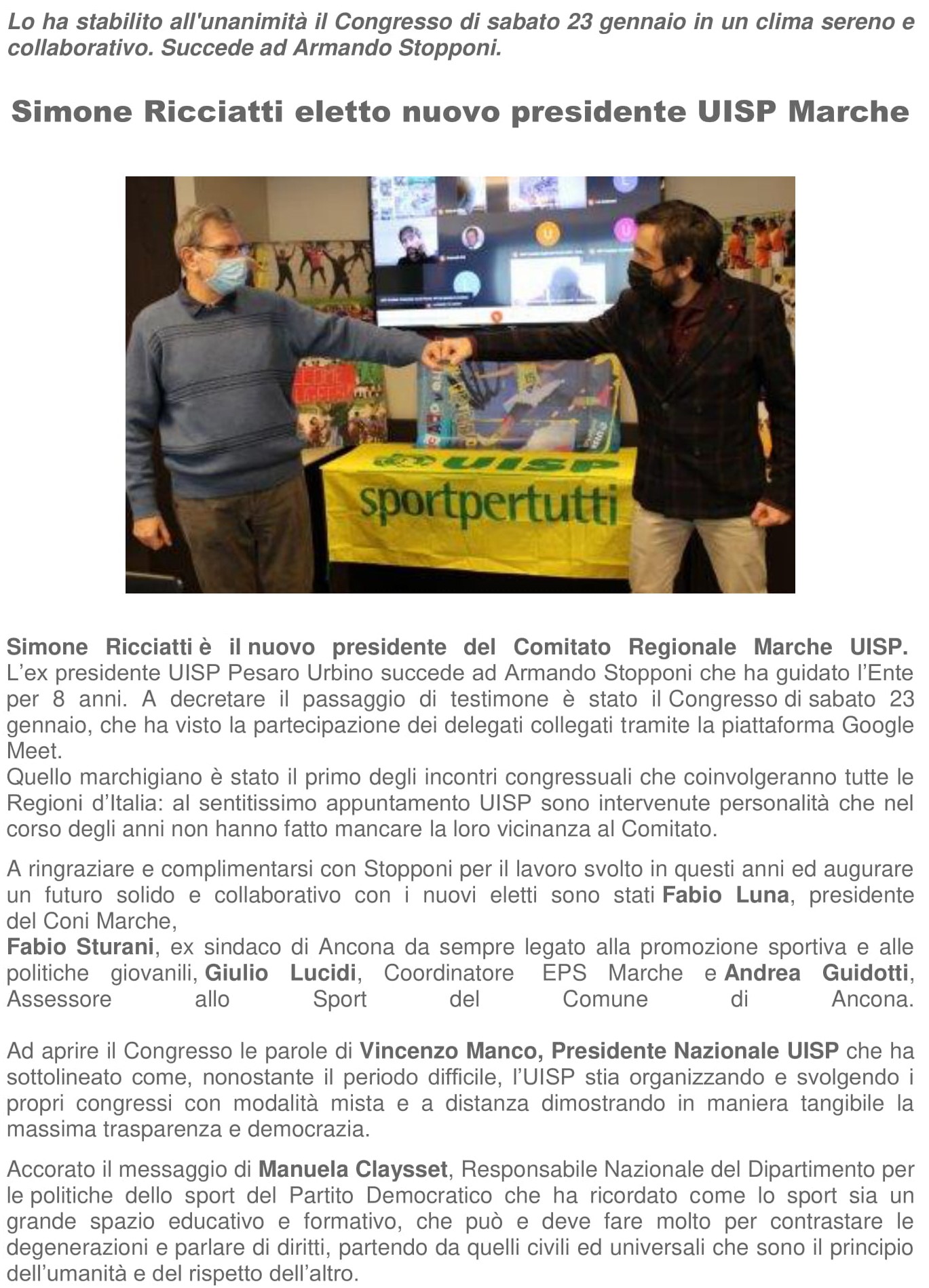 Simone Ricciatti eletto nuovo presidente UISP Marche Leggi tutto: Simone Ricciatti eletto nuovo presidente UISP Marche